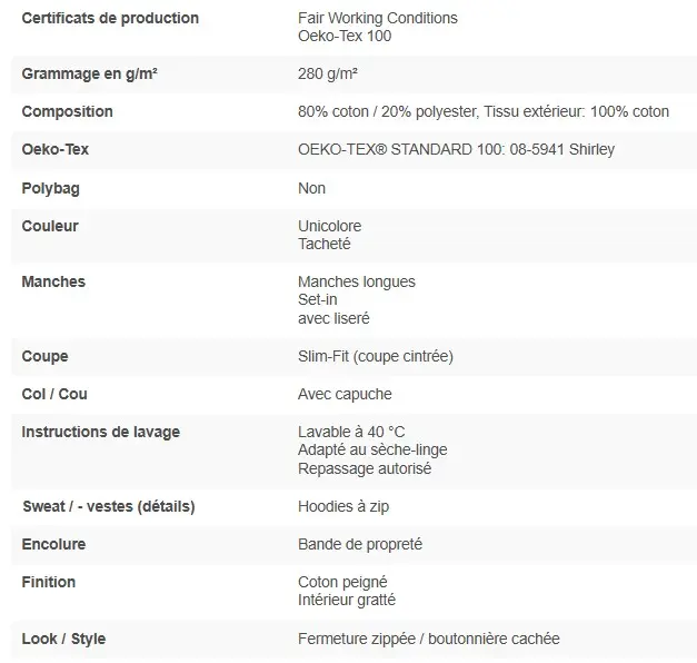 280 g/m², 80% coton / 20% polyester, Tissu extérieur: 100% coton